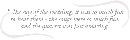 This is perhaps the most widely used ensemble. It is a full, vibrant sound that can fill a large cathedral, but, subtle enough as to not get in the way of your important event. This ensemble can do all of the traditional and contemporary music on our list It includes 2 violins, viola, and cello.